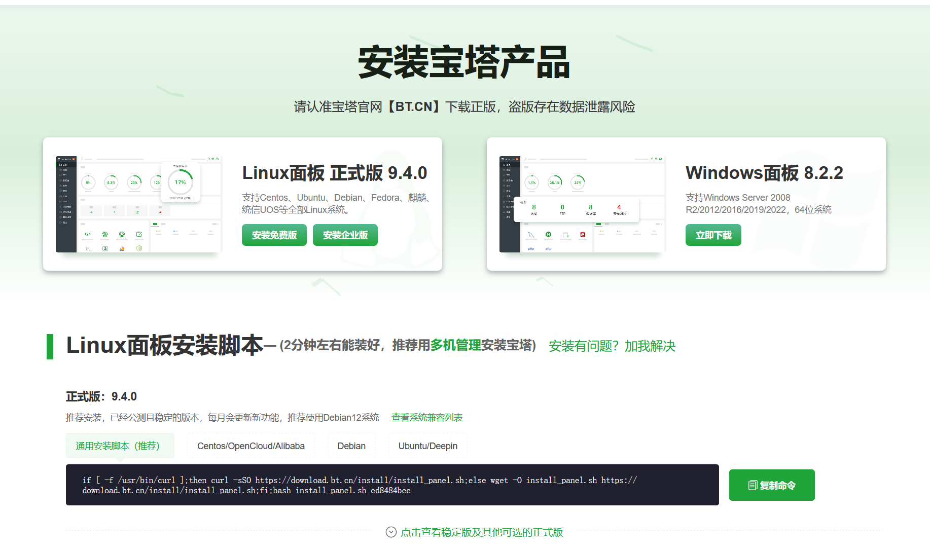 liunx通用安装脚本:if [ -f /usr/bin/curl ];then curl -sSO https://download.bt.cn/install/install_panel.sh;else wget -O install_panel.sh https://download.bt.cn/install/install_panel.sh;fi;bash install_panel.sh ed8484bec